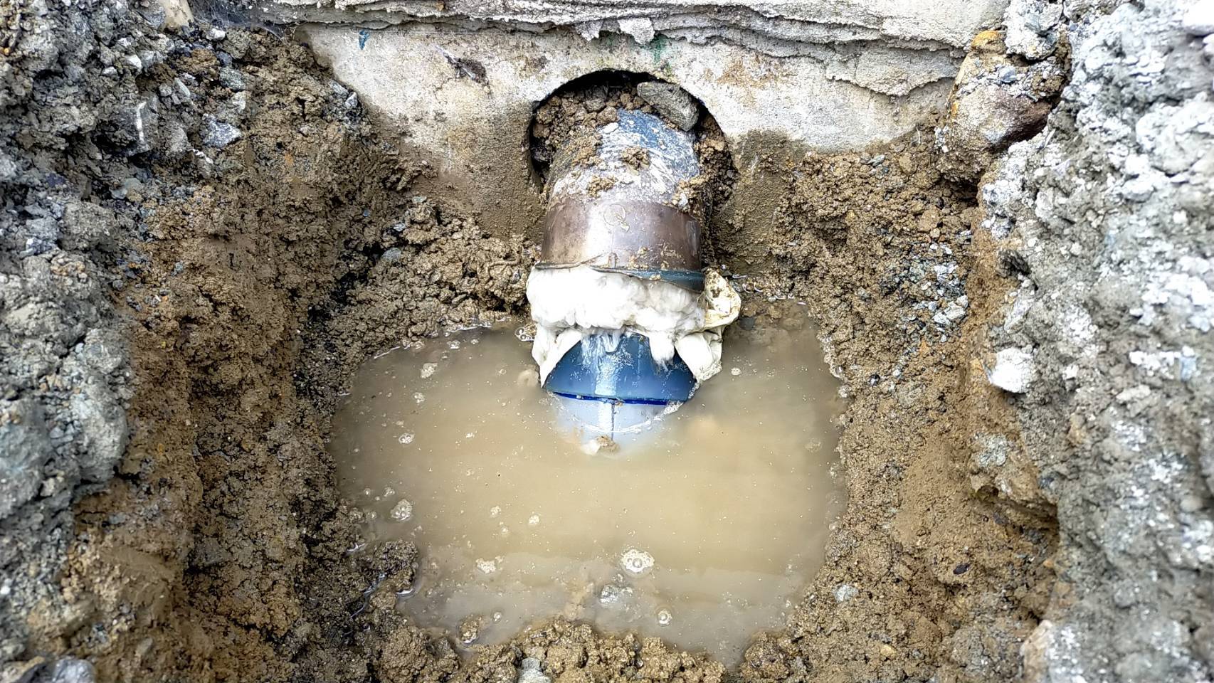 地中から掘り起こされた排水管。長年の使用により経年劣化が進み、ひび割れから水が漏れていたことが分かります。