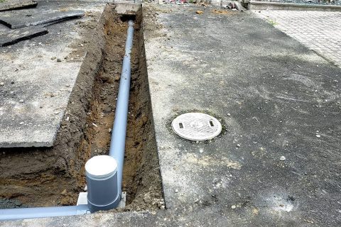 まずは、コンクリート地面の切削と掘削から作業がスタートします。上の写真では、地面をカットして掘削し、新設する排水管を敷設するためのルートを確保しています。地面の下にしっかりと勾配を確保しながら、配管が適切に接続できるよう慎重に作業を進めます。
